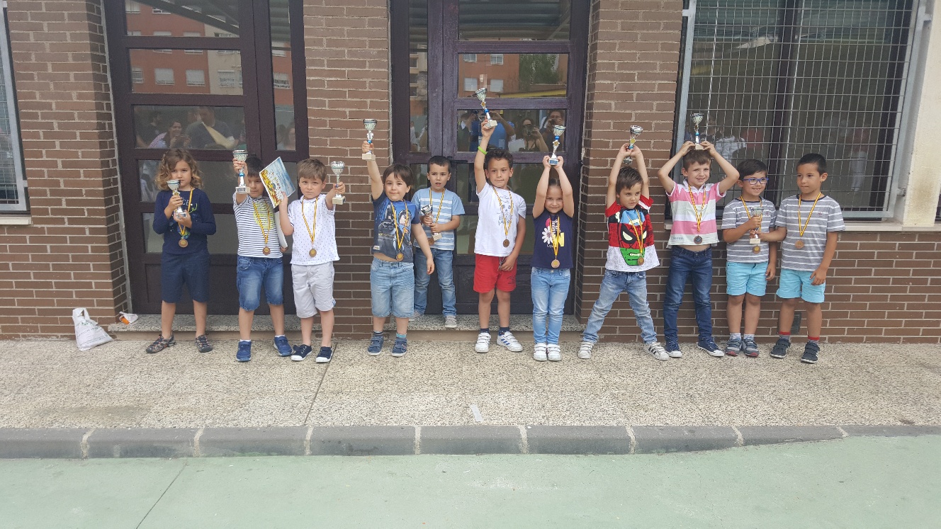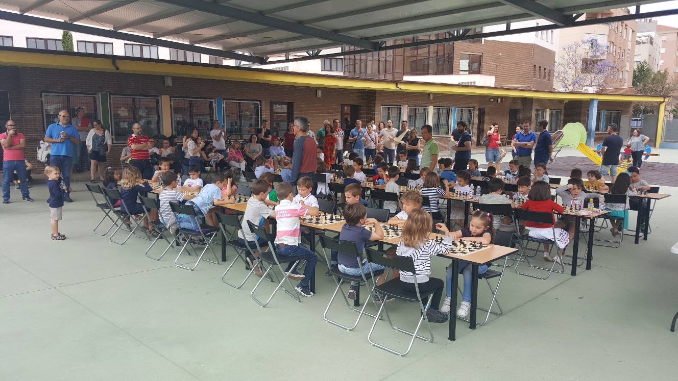 55 jugadores se inscribieron en el II Torneo de Carrera de Peones IICarreraPeones.trn, que se jugó el sábado 2 de junio. Sólo podían participar alumnos de 3º de infantil y se lo pasaron en grande. Una autentica promoción del ajedrez a una edad muy temprana, donde lo importante era participar y jugar con otros compañeros de otros colegios. Todos se llevaron una medalla y un libro de ajedrez infantil, aparte del tradicional almuerzo para recuperar energías. Los diez mejores que tuvieron la fortuna de llevarse trofeo fueron: