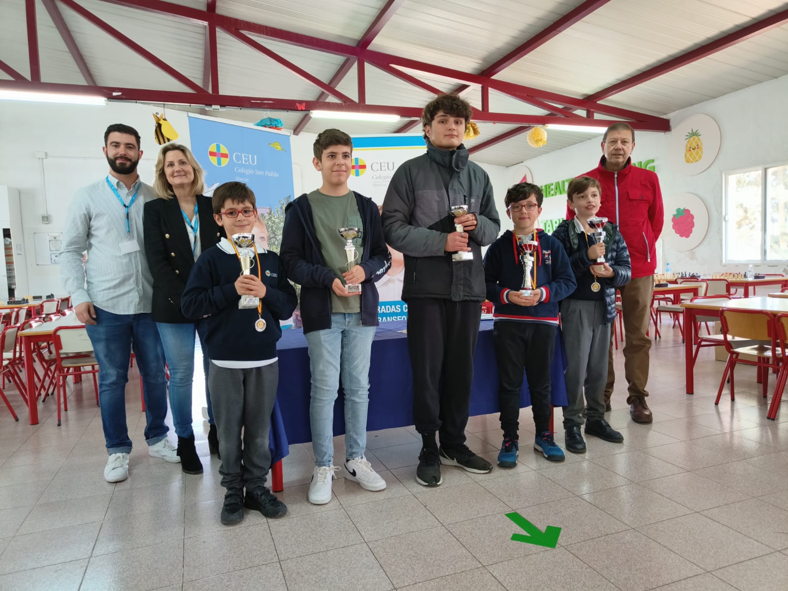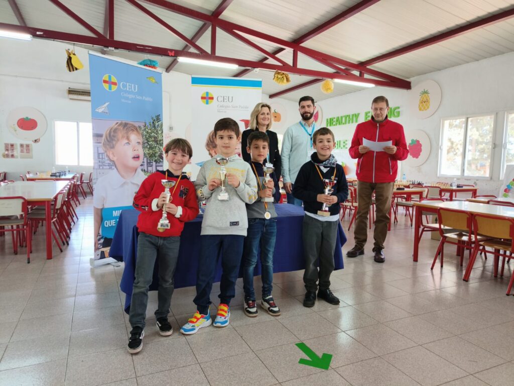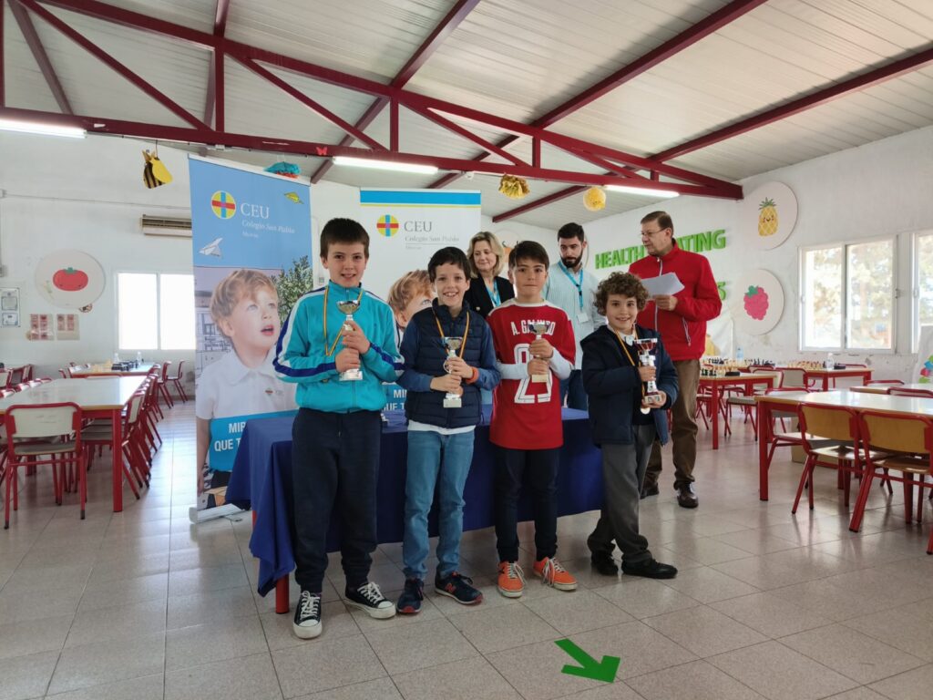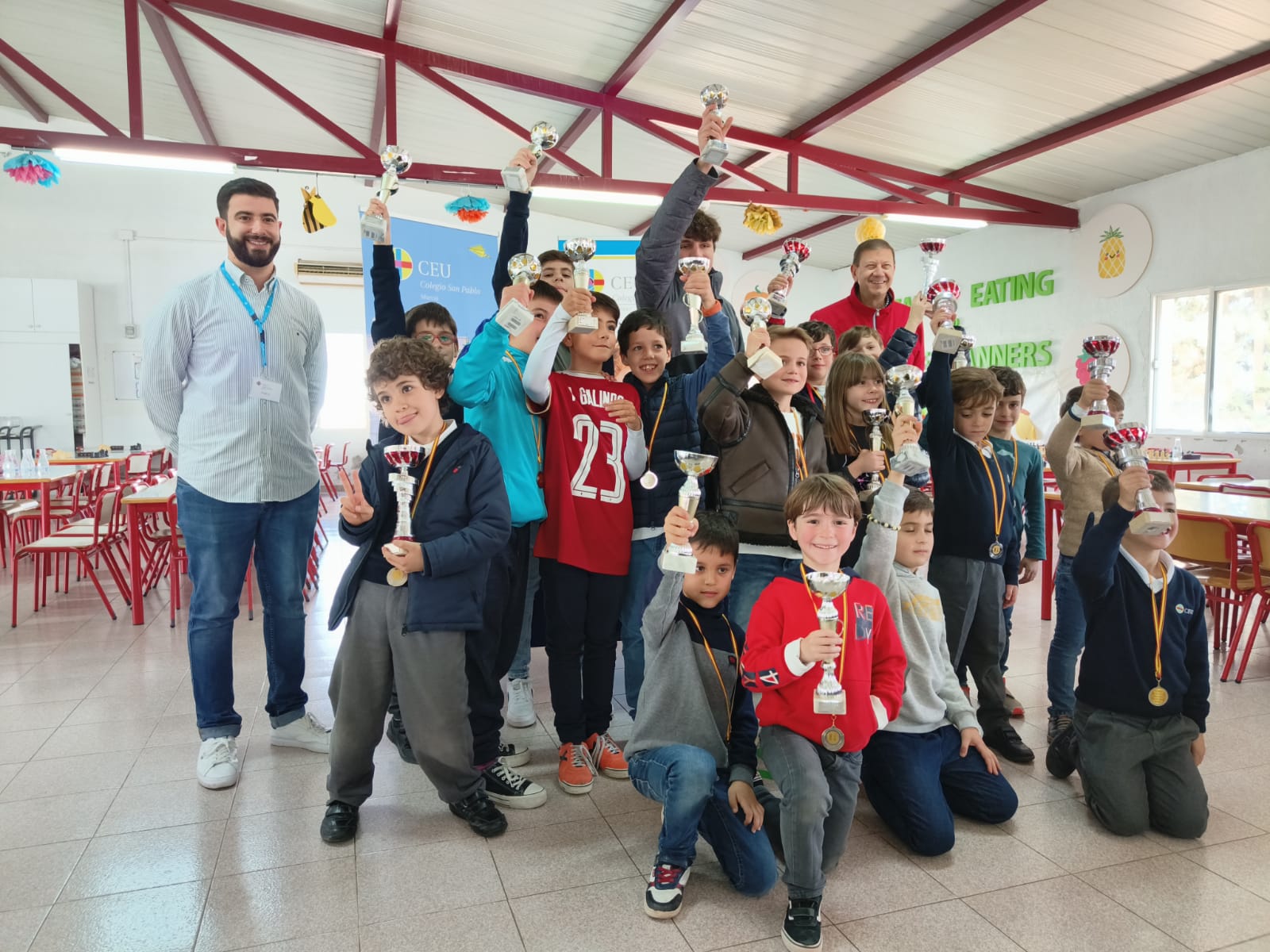 El domingo 19 se celebró en el Colegio CEU San Pablo el V torneo del XVI Circuito Escolar Educajedrez. Con una amplia asistencia, nos acompañaron en la entrega de trofeos Lola, coordinadora de las actividades extraescolares y Pablo, el profesor de ajedrez. Un buen tándem que está haciendo que aumente el número de alumnos que se apuntan al ajedrez y realizando una estupenda promoción del deporte-juego-ciencia.