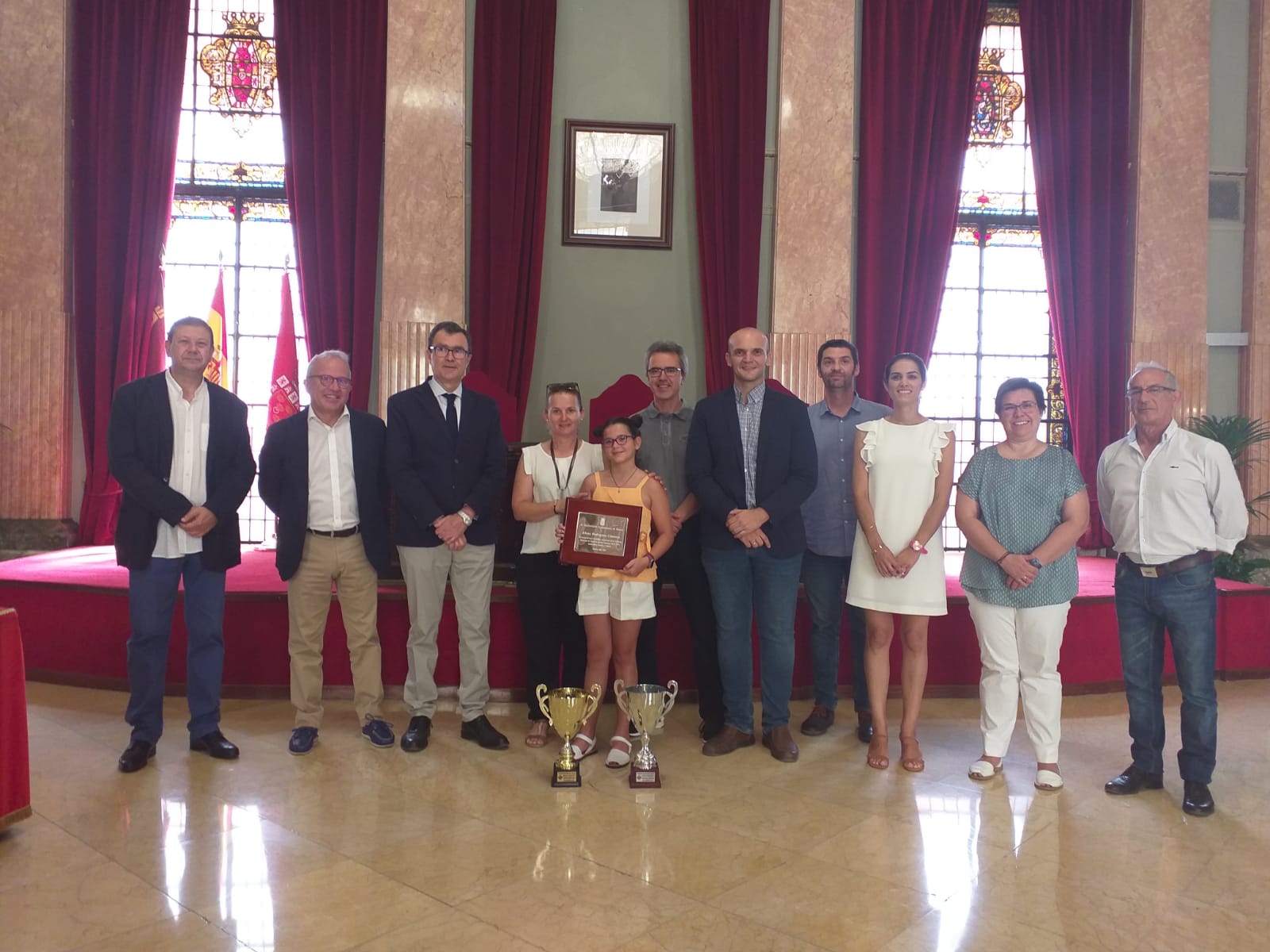 El alcalde de Murcia, José Ballesta, junto al concejal de Deporte y Salud, Felipe Coello, ha felicitado a la campeona de ajedrez en la categoría benjamín sub-10, Elena Rodríguez Cánovas, por su primer puesto en el Campeonato de España de Ajedrez. Durante el acto, el regidor ha entregado a la deportista murciana una placa conmemorativa en el Salón de Plenos del Ayuntamiento.