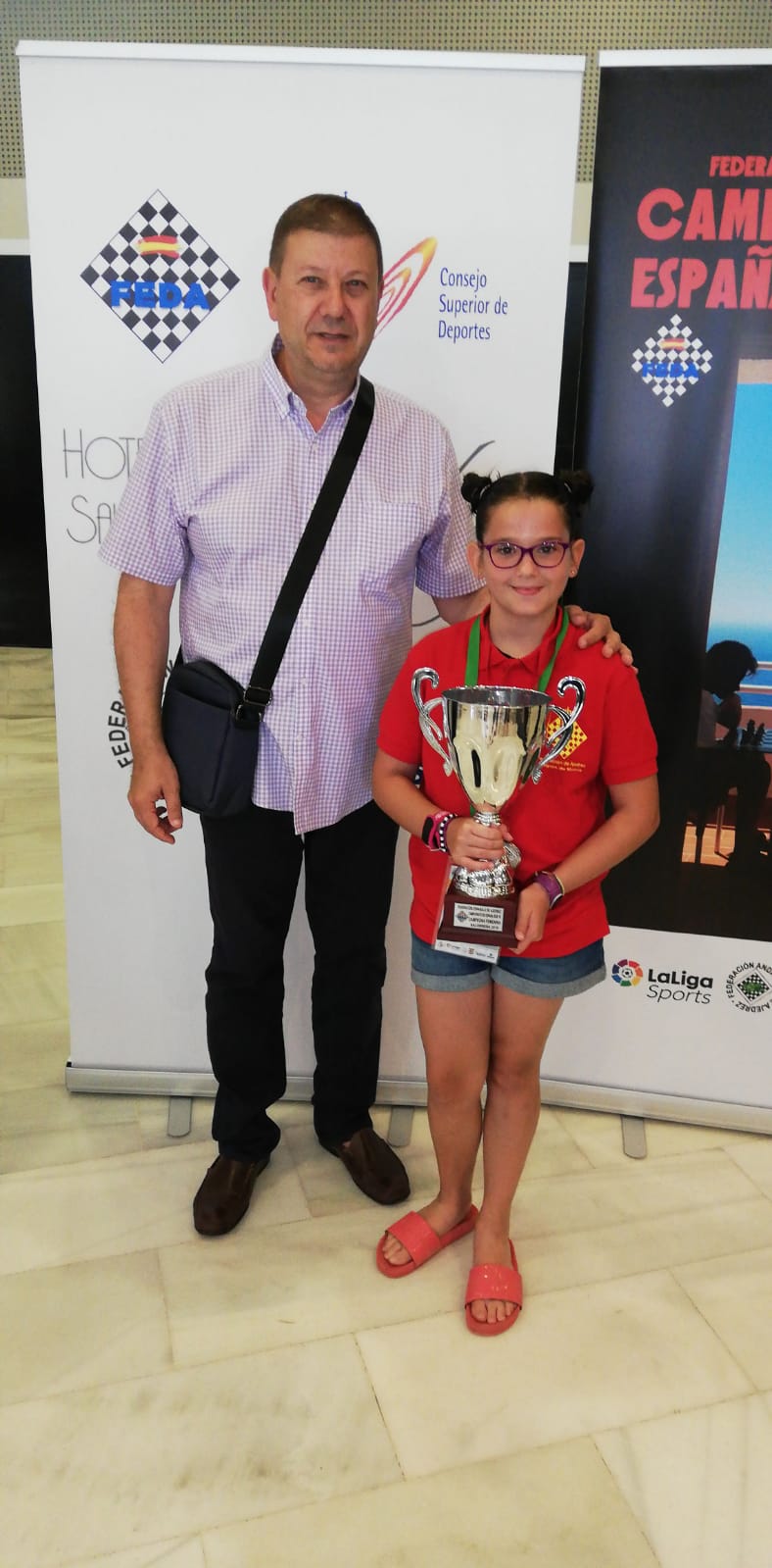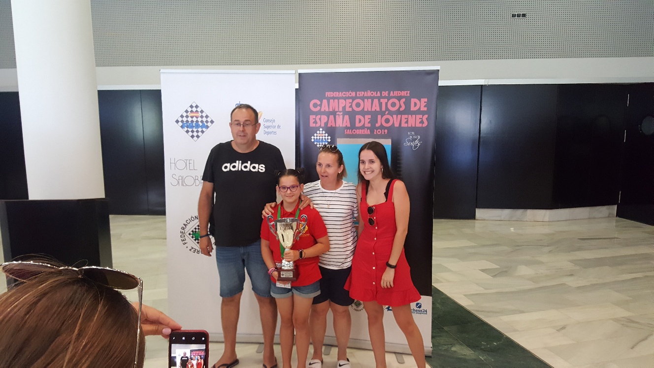 Durante la semana del 24 al 30 de junio la Federación Española de Ajedrez organizó el Campeonato de España Benjamín (nacidos en 2010 y 2009). Representantes de todas las Comunidades Autónomas se dieron cita y todos los niños tenían una sola ilusión: ser campeones/as. Elena representó a la Comunidad Autónoma por ser la actual Campeona Regional y participando en los dos torneos: el de lentas con un tiempo por partida de 90 minutos + 30 seg de incremento por jugada y el otro de rápidas de 10 minutos + 5 seg. Gano los dos con autoridad y se alzó con los dos títulos, cosa que jamás se había producido en el ajedrez murciano. Haciendo un poco de historia, Elena aprendió el ajedrez en 1º de Primaria en el colegio La Consolación de Espinardo, justo cuando empezamos a dar clases en horario lectivo. Enseguida reconocimos su talento y hablando con los padres se sacó licencia con el Club Casa de Ajedrez de Murcia. Desde entonces no ha parado de jugar torneos. La parte teórica ha sido impartida por lo monitores Eugenio Cuberos García y Francisco Diego García Albarracín. Todas estas circunstancias unidas a sus cualidades como el tesón, una gran voluntad, inteligencia y humildad nos ha llevado al gran triunfo que hoy celebramos. Elena, desde el Club Casa del Ajedrez de Murcia sólo te decimos una palabra: ¡¡¡GRACIAS!!!