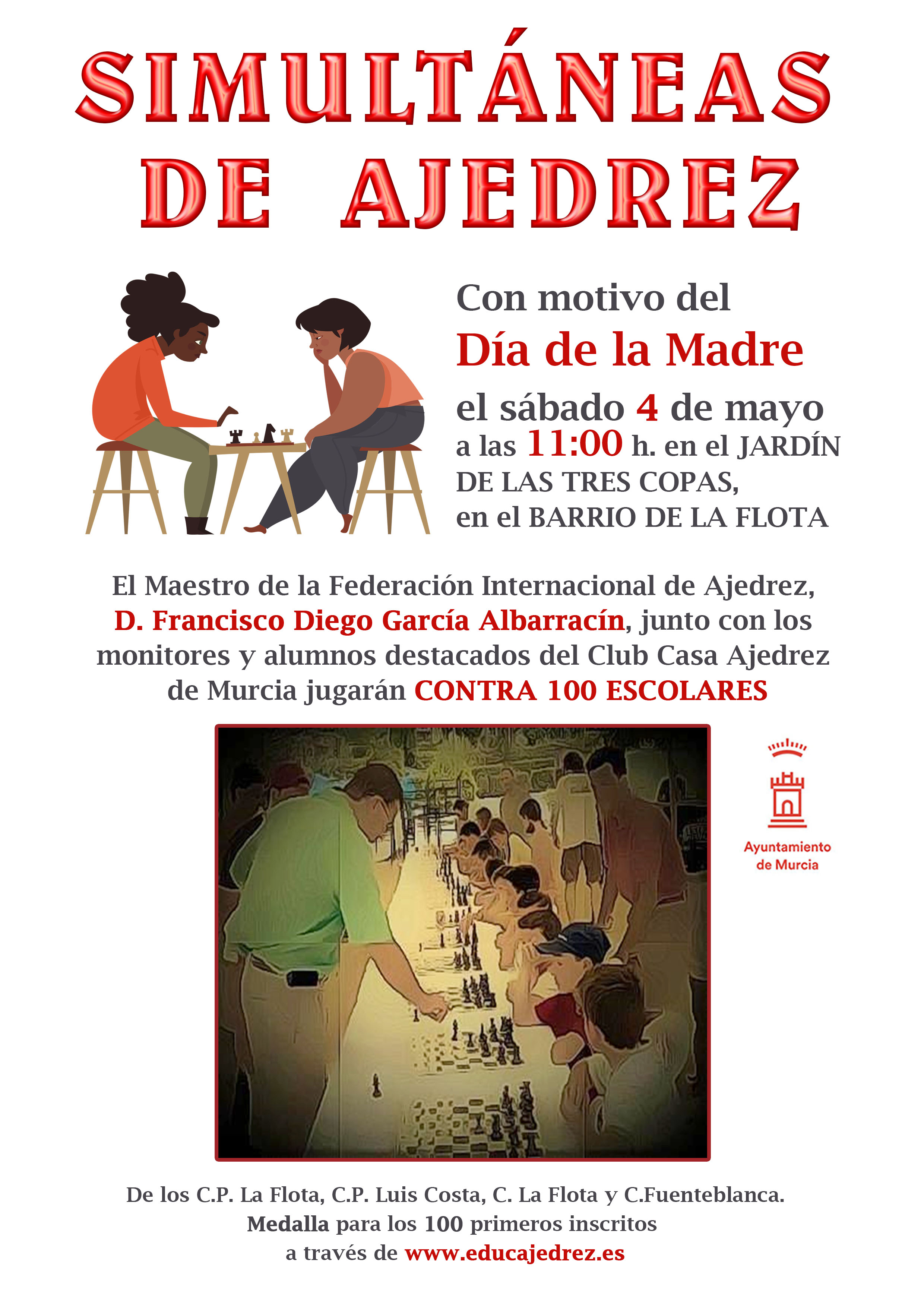 Con motivo del Día de la Madre, el sábado 4 de mayo a las 11 de la mañana se celebró en el JARDÍN DE LAS TRES COPAS, en el BARRIO DE LA FLOTA UNAS SIMULTÁNEAS DE AJEDREZ