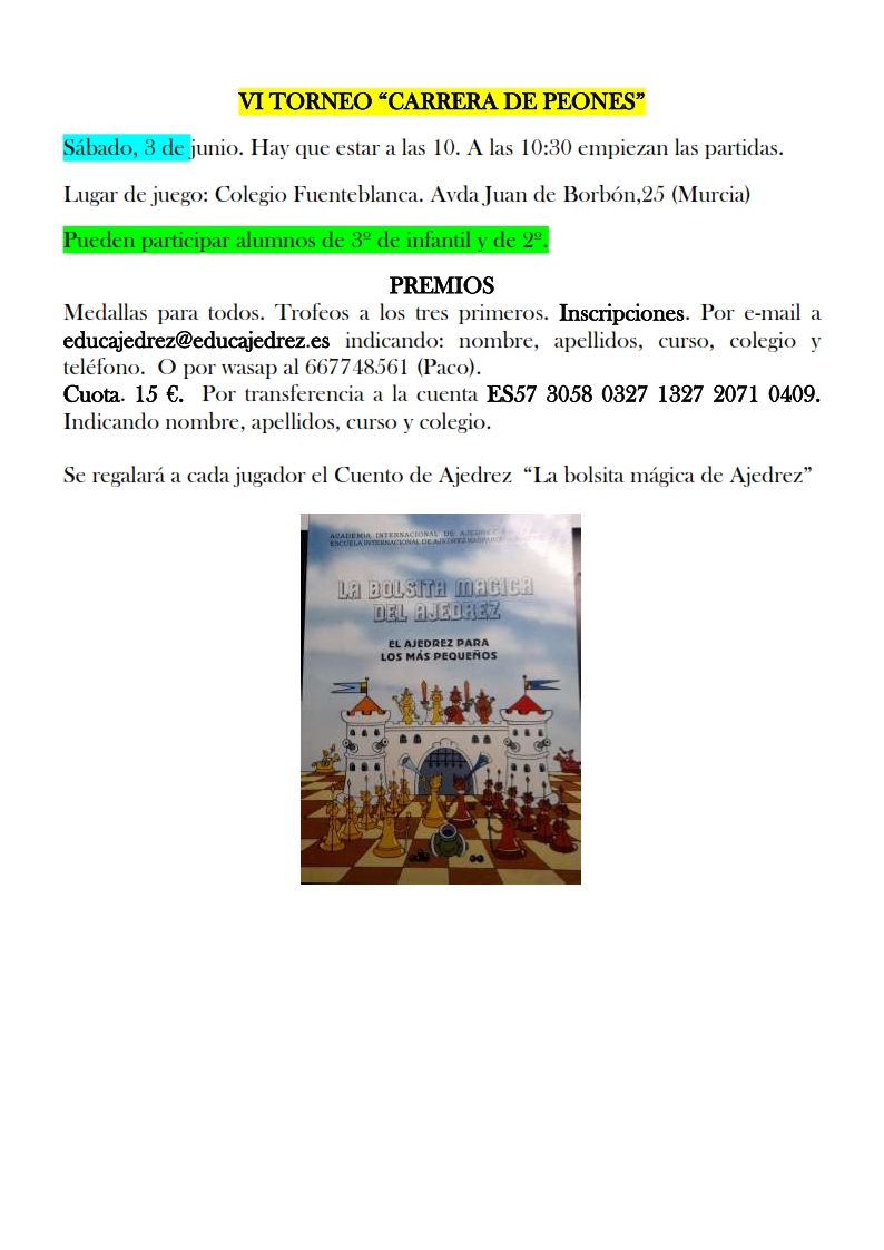 Este torneo está pensado para los más peques de la casa (2º y 3º de infantil) para iniciarlos en los torneos de ajedrez. Consiste en jugar carreras de peones y gana el que llega primero a la última fila. Más información en la imagen.