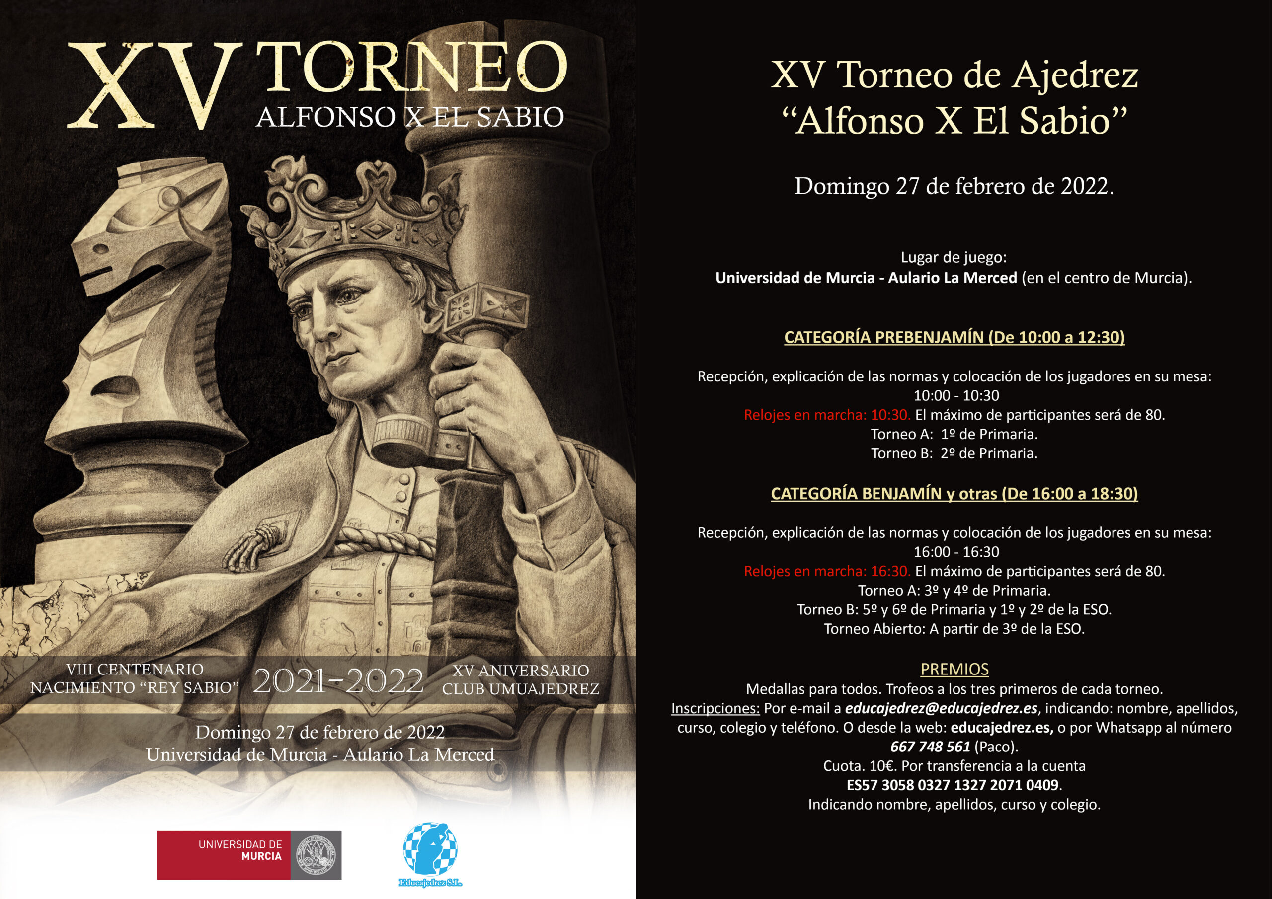 Medallas para todos. Trofeos a los tres primeros de cada torneo. Inscripciones. Por e-mail a educajedrez@educajedrez, indicando: nombre, apellidos, curso, colegio y teléfono. O desde la web:educajedrez.es . O por wasap al 667748561 (Paco).